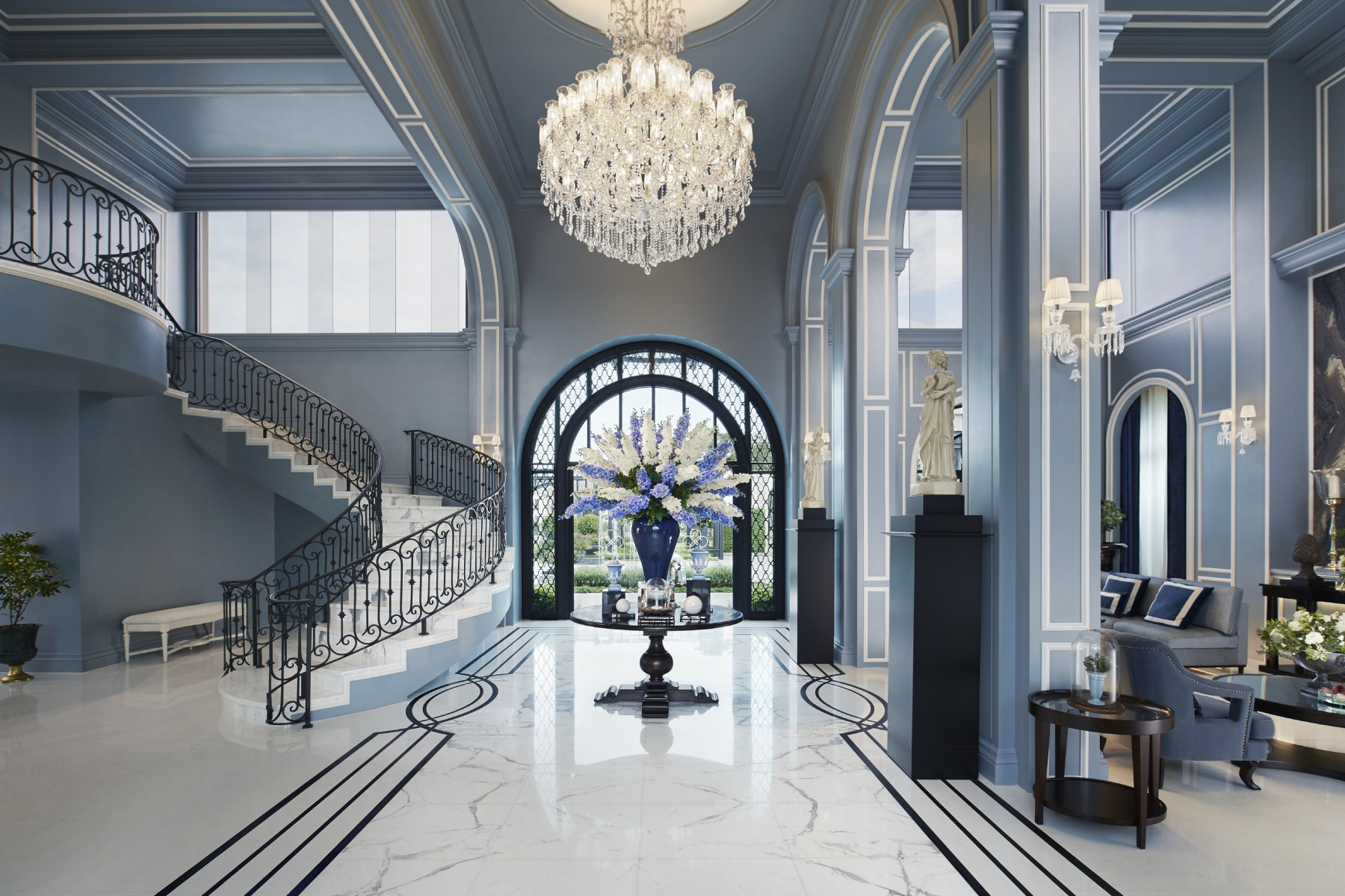 อีกหนึ่งศิลปะขั้นสูงอันวิจิตรบรรจง ที่ขึ้นชื่อว่าเป็น Iconic Piece แห่งยุครีเจนซี่ คือภาชนะเครื่องเคลือบพอร์ซเลน (Porcelain) แบรนด์ Wedgwood Jasperware ที่มีสีฟ้าอันเป็นเอกลักษณ์เฉพาะตัว ซึ่งได้รับความนิยมในเหล่าราชวงศ์อังกฤษจนได้รับพระราชทานอนุญาตให้ใช้ชื่อว่า Queen’s Ware และแรงบันดาลใจจาก Wedgwood Jasperware มาใช้ตกแต่งภายในโครงการ เพิ่มบรรยากาศผ่อนคลายภายในคลับเฮาส์ด้วยโทนสีฟ้า Wedgwood Blue และลวดลายอ่อนช้อยสีขาวอันเป็นเอกลักษณ์ แต่งแต้มความตระการตาด้วยวัสดุเลอค่าอย่างหินอ่อน Cipollino Rosso ทำให้โครงการนี้โดดเด่นที่เพียงแค่มองก็รับรู้ถึงวิจิตรของเส้นสายสไตล์รีเจนซี่