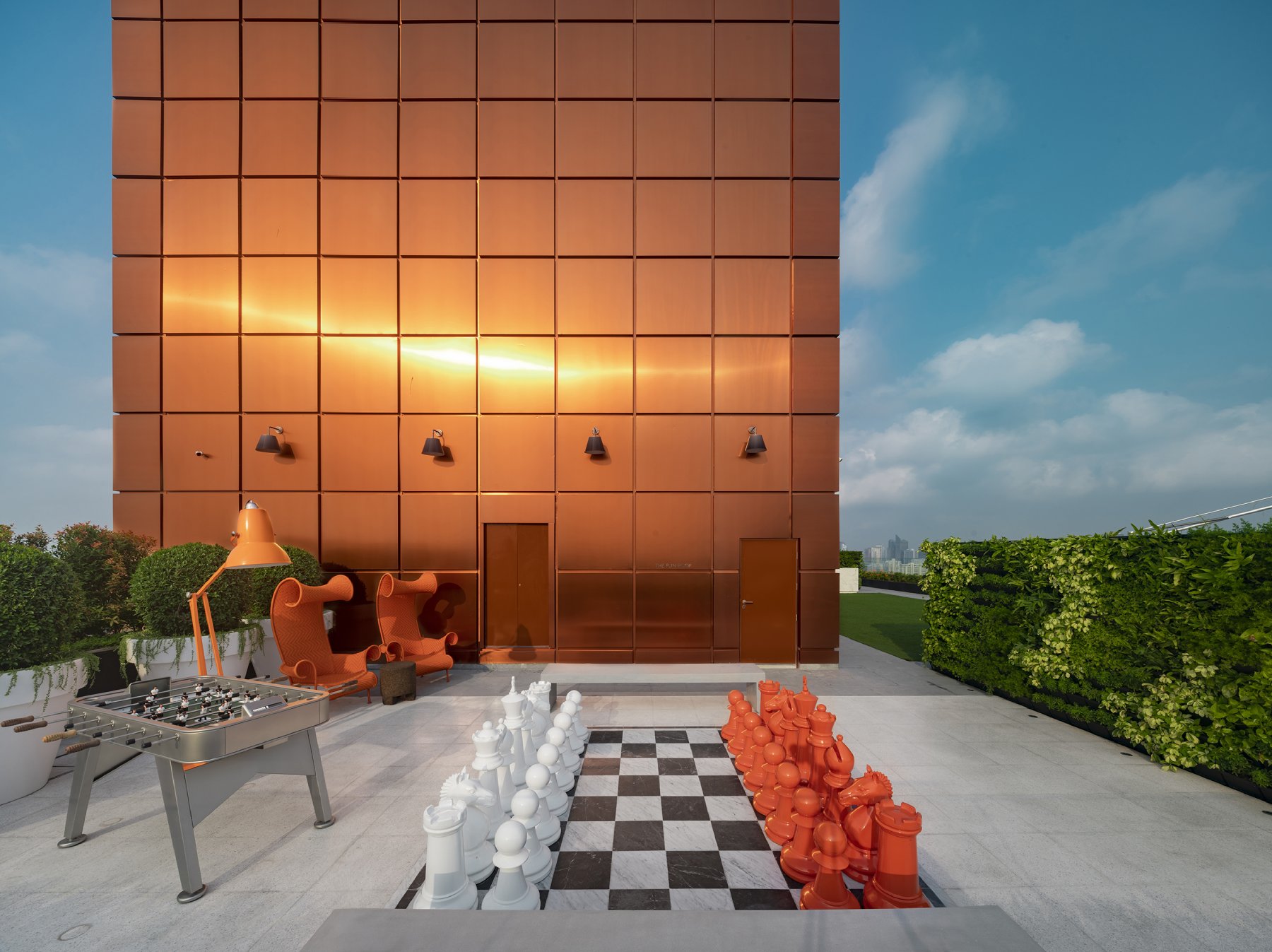 โดดเด่นจนแทบละสายตาไม่ได้ และทำให้เราต้องรู้สีกใจเต้นแค่เพียงเห็น ด้วย Facade สีคอปเปอร์จากอลูมิเนียมและ Glass Wall ที่สร้างเสน่ห์อันย้อนแย้งแต่งดงาม กลมกลืนอย่างเหนือคาดไปกับกำแพงหิน เพียงแค่ภาพลักษณ์ภายนอกก็ทำให้โครงการนี้กลายเป็นแลนด์มาร์กสำคัญบนเส้นทองหล่อ ความชัดเจนในสไตล์ Industrial Heritage ยิ่งดูมีชีวิตชีวาเมื่อถูกถ่ายทอดจากฝีมือของดีไซเนอร์อัจฉริยะ Philippe Starck ที่สร้างผลงานให้โลกได้ชื่นชมมาแล้วมากมาย ดีไซเนอร์ผู้นี้ได้เดินทางมาสัมผัสบรรยากาศบริเวณย่านทองหล่อด้วยตัวเอง ก่อนที่จะร่วมออกแบบโครงการในทุกมิติ ทั้งฟังก์ชัน การคัดสรรวัสดุและเฟอร์นิเจอร์ ควบคุมทุกขั้นตอนแม้ในรายละเอียดเพื่อดึงเสน่ห์ของ Industrial Heritage ออกมาให้ได้มากที่สุด เช่น การใช้วัสดุแบบ Raw Beauty ที่ตอกย้ำความเป็น Timeless Desgin ทั้งยังใส่ลูกเล่นอย่างมีชั้นเชิง สอดแทรกไว้ด้วยชิ้นงานโปรดักส์อันโด่งดัง และส่งต่อความครีเอทีฟผ่านเฟอร์นิเจอร์โอเวอร์สเกลที่ทำให้ Khun By Yoo เปรียบเสมือนงานศิลปะที่จะทวีมูลค่าสูงขึ้นในอนาคต