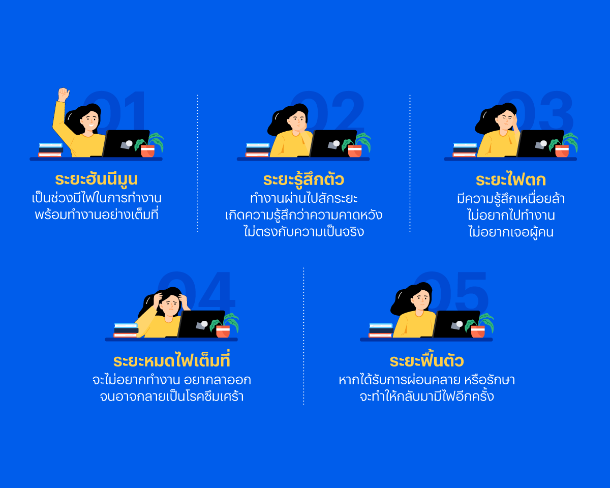 ระยะหมดไฟเต็มที่ (full scale of burnout) เมื่อรู้สึกหมดไฟอย่างเต็มที่จะไม่อยากทำงาน อยากลาออจากงาน รู้สึกสิ้นหวังและหมดความมั่นใจในตัวเอง ซึ่งอาจจะทำให้เป็นโรคซึมเศร้าตามมาได้