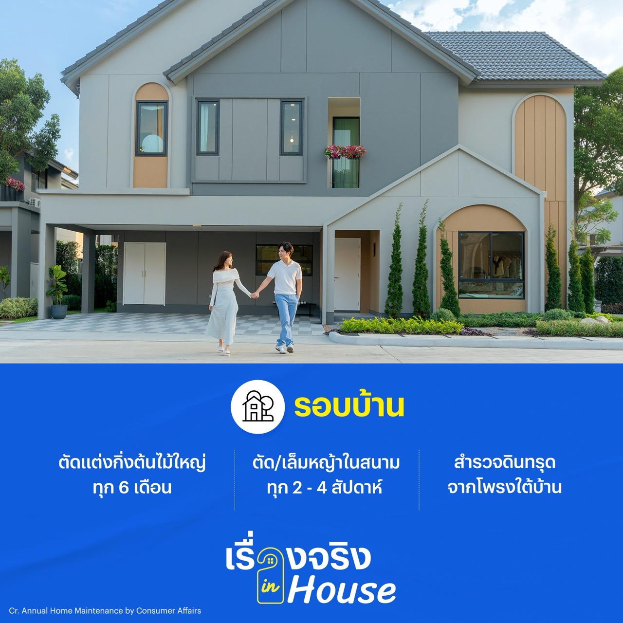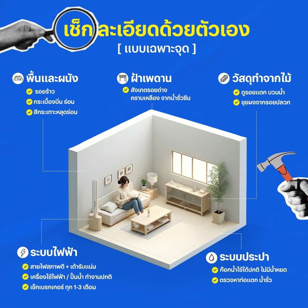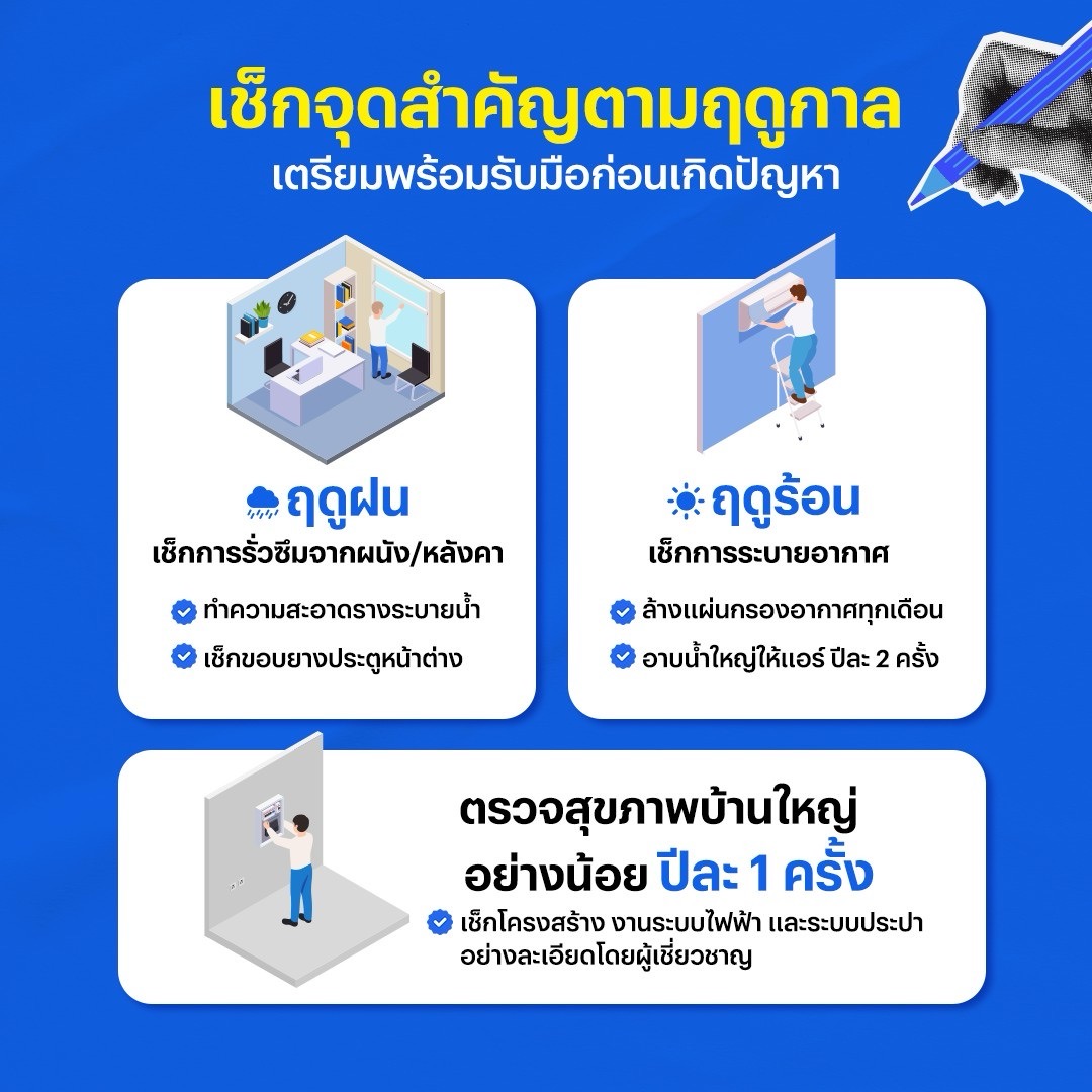 เพราะ “บ้าน” ก็เหมือนร่างกายมนุษย์ที่มีอายุขัย ต้องหมั่นตรวจสุขภาพและดูแลอยู่เสมอ แม้ว่าจะเป็นจุดเล็กๆ ก็ตาม ไม่ว่าจะเป็นเรื่องความสะอาด ความผิดปกติเล็กๆ น้อยๆ ที่ถ้าปล่อยทิ้งไว้อาจสะสมกลายเป็นปัญหาใหญ่ในอนาคต