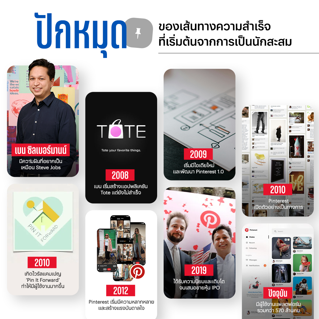 เบน นึกถึงงานอดิเรกในวัยเด็กที่เขาชอบการสะสมแมลงและแสตมป์ จึงได้นำไอเดียนี้มาผสมกับแอปพลิเคชัน Tote จนกลายมาเป็นไอเดียใหม่และเกิดเป็น Pinterest ที่เป็นการเชื่อมโยงระหว่าง ‘Pin’ การปักหมุด และ ‘Interest’ สิ่งที่เราสนใจเข้าด้วยกัน จนเกิดเป็น Pinterest 1.0