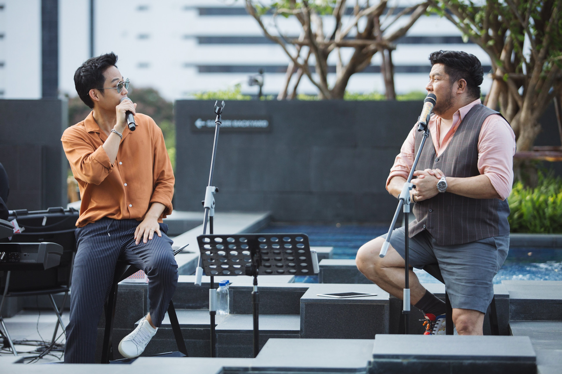 ยิ่งเมื่อเสียงเพลงคุ้นหู ‘ก็ยังคงรอให้ใครสักคนเดินเข้ามา ก็ยังไม่รู้ว่าเราจะเจอกันเมื่อไร…’ หรือ ‘ได้แต่ฝากความคิดของฉันเอาไว้ เผื่อวันไหนเธอผ่านมา…’ และอีกมากมาย ลอยผ่านบรรยากาศสบายๆ ริมสระน้ำสีฟ้าใสยาวกว่า 50 เมตร ผ่านแมกไม้สีเขียวร่มรื่น ไปกระทบอาคารสูงใหญ่ของโครงการ ส่งเสียงกังวานผ่านไปถึงลูกบ้านตามชั้นต่างๆ กลายเป็นมวลความสุขที่แผ่ขยายไปทั่วจนแม้แต่คนที่ชมผ่าน Live ก็ยังรู้สึกได้