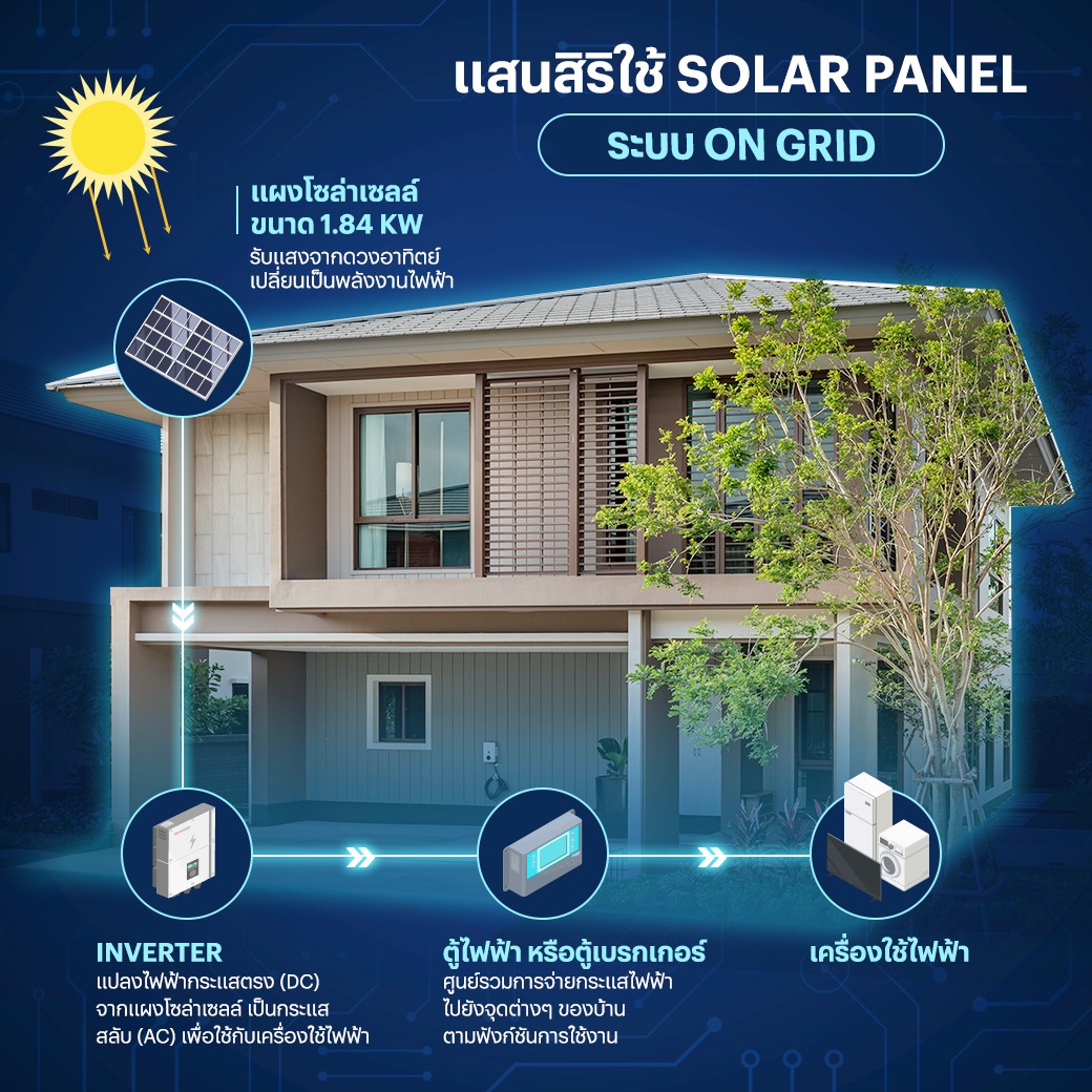 โดยที่แสนสิริ เราใช้ระบบบออนกริด ซึ่งเป็นระบบโซล่าที่ใช้ทั้งไฟจากการไฟฟ้า และไฟฟ้าที่ผลิตได้จากแผงโซลาร์ เหมาะกับบ้านที่ใช้ไฟฟ้าในช่วงเวลากลางวัน ไม่มีแบตเตอรี่ ผลิตไฟฟ้าได้แล้วใช้เลย (ระบบที่แสนสิริยังไม่สามารถขายไฟคืนให้การไฟฟ้าได้)
