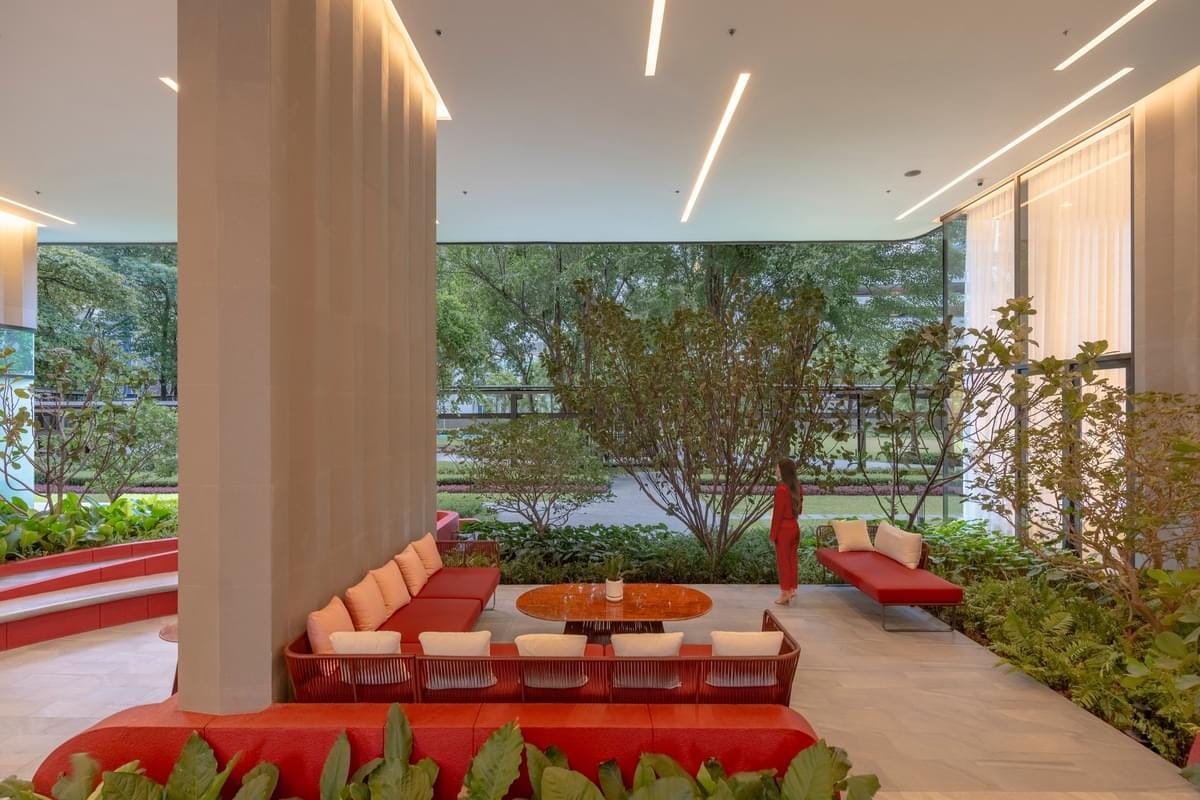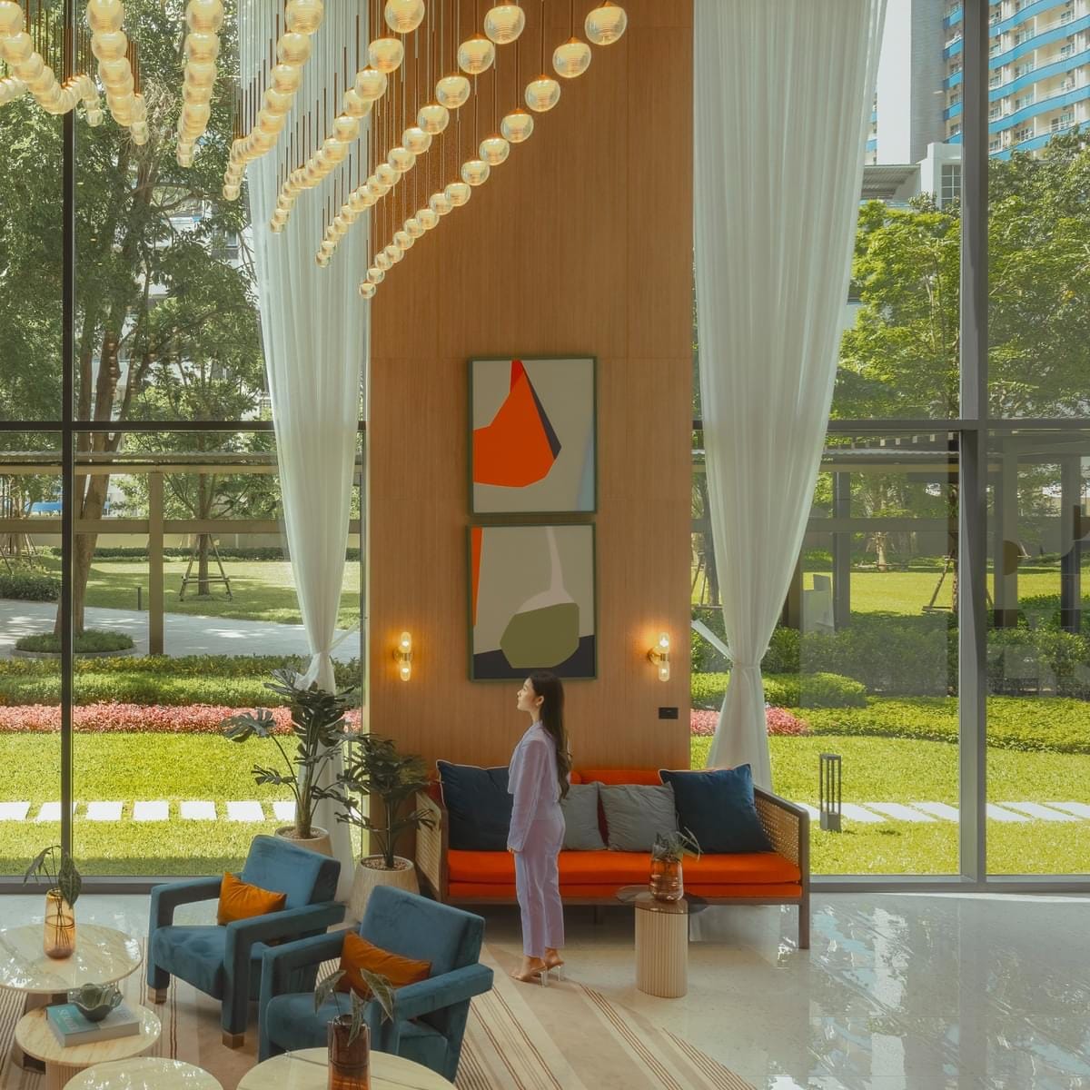 ล็อบบี้ออกแบบให้รับแสงธรรมชาติ และยังทำให้เห็นพื้นที่สีเขียวของโครงการแบบใกล้ชิด