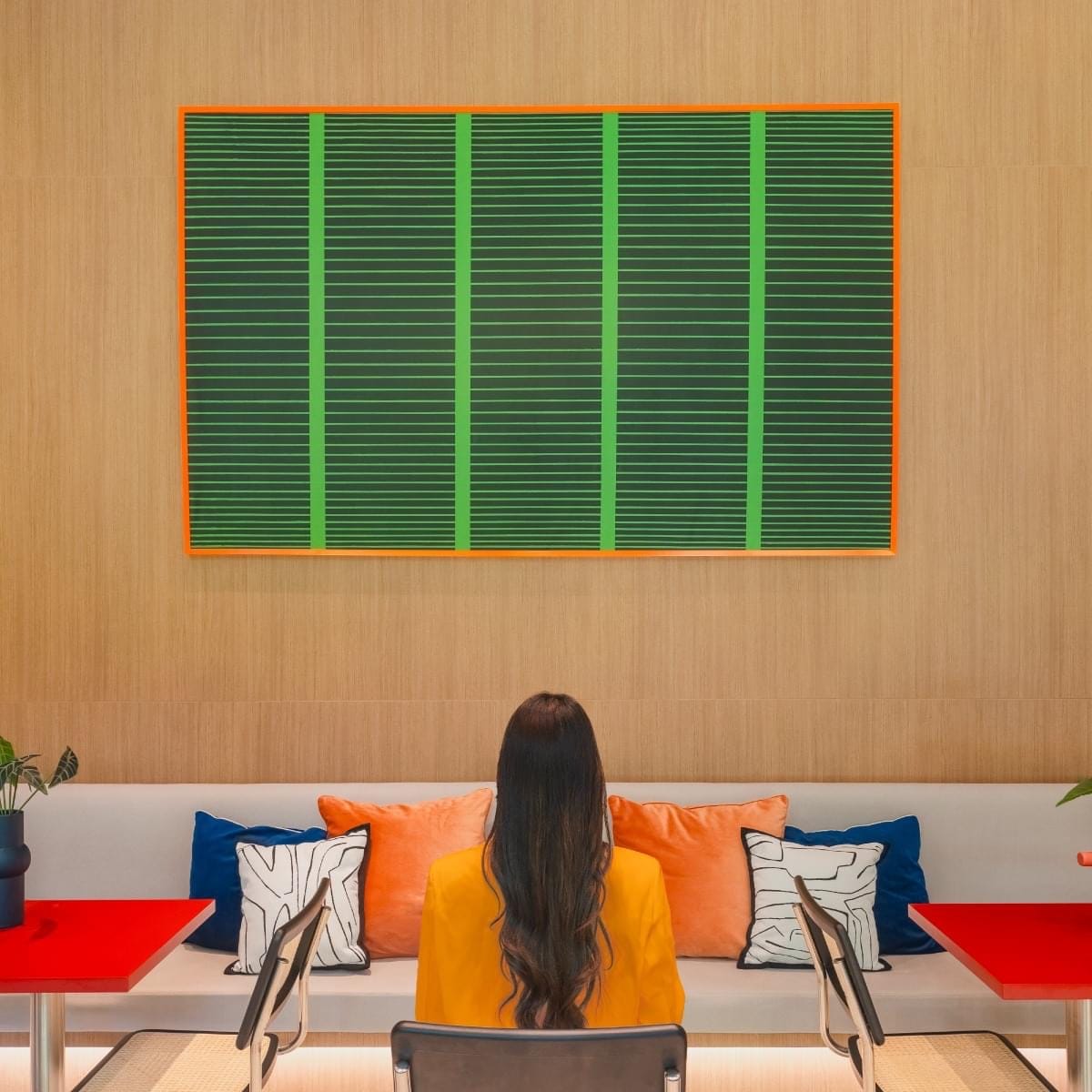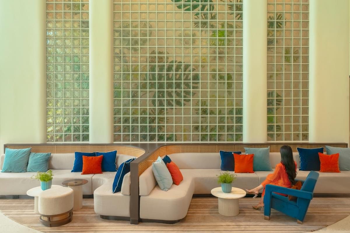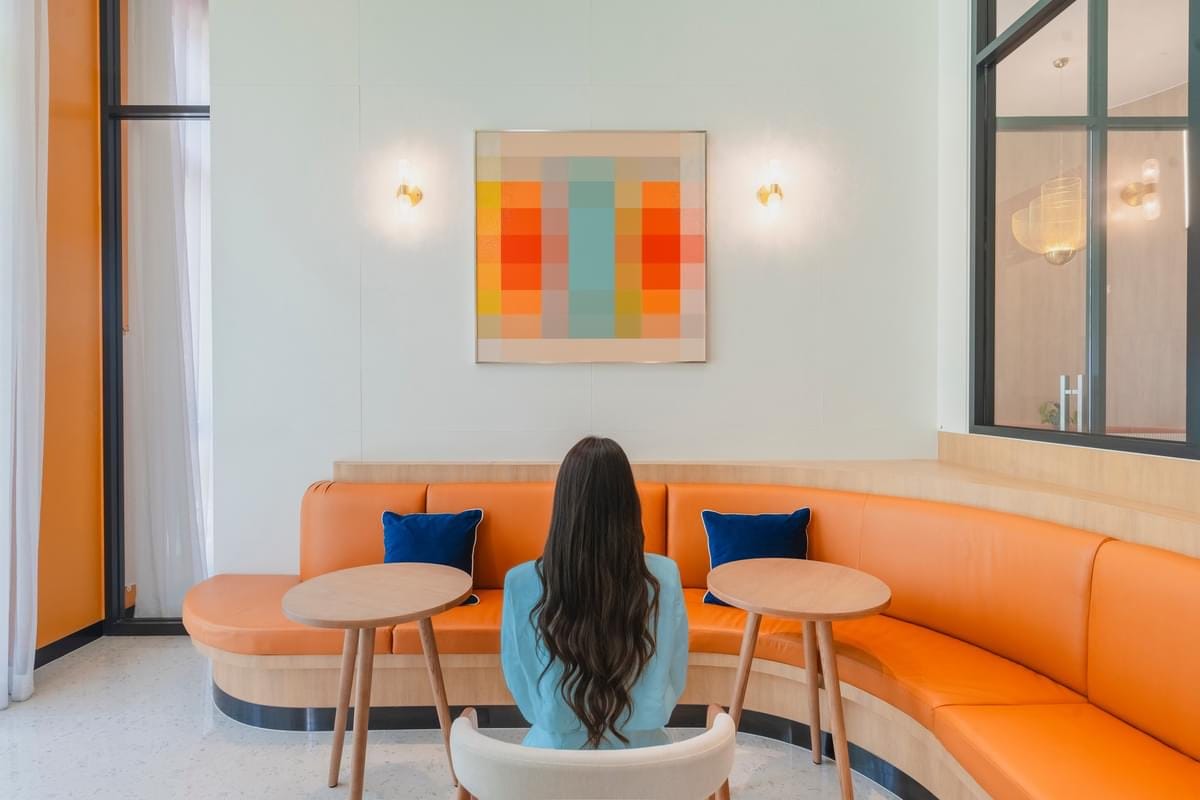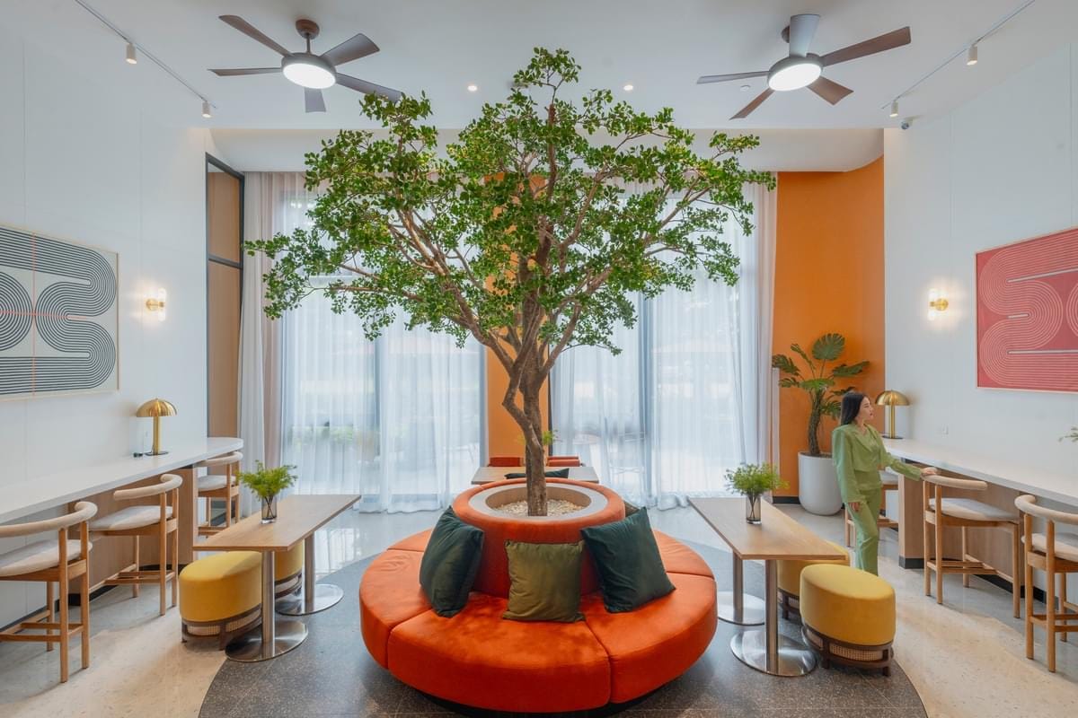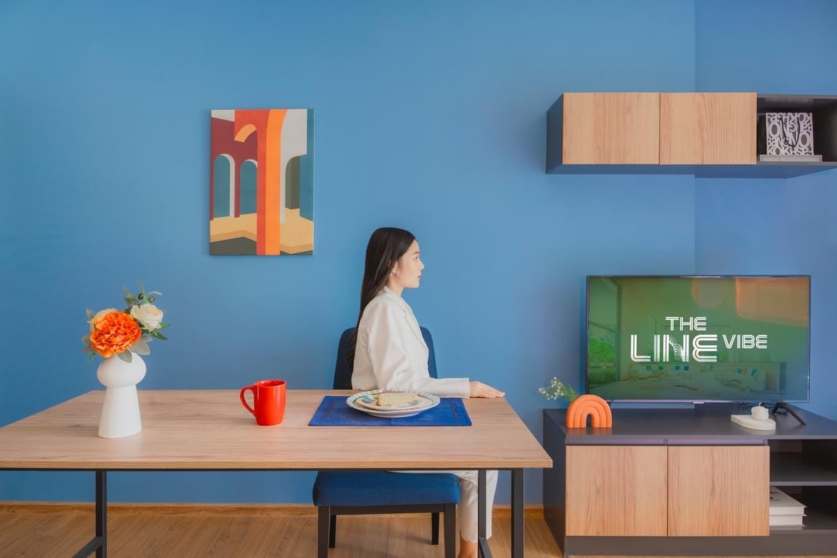การออกแบบตัวอาคารที่ใช้สีสันสดใส และมีชีวิตชีวา เน้นดีไซน์ Dynamic ที่แทรกความสนุกสนานในทุกองค์ประกอบ ห้องนี้สะท้อนถึงการตอบโจทย์ไลฟ์สไตล์คนเมืองที่ต้องการพื้นที่พักผ่อนที่ผสานกับการใช้ชีวิตที่หลากหลาย