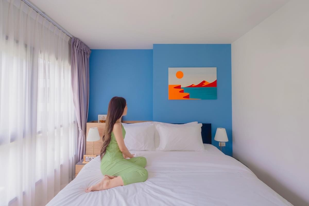 ห้องนอนที่ออกแบบให้มีบรรยากาศที่เงียบสงบและเป็นส่วนตัว สีสันที่เลือกใช้เน้นไปที่การสร้างความผ่อนคลาย