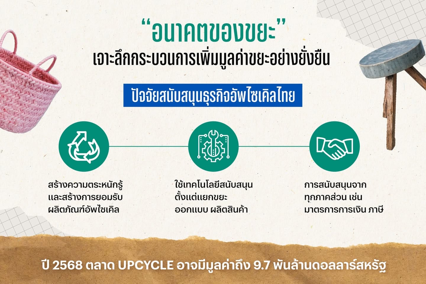 และด้วยโอกาสทางธุรกิจอันมากมายนั้น แน่นอนว่าสิ่งสำคัญที่สุดคือแรงสนับสนุนธุรกิจรีไซเคิลและอัพไซเคิล โดยเฉพาะในประเทศไทย